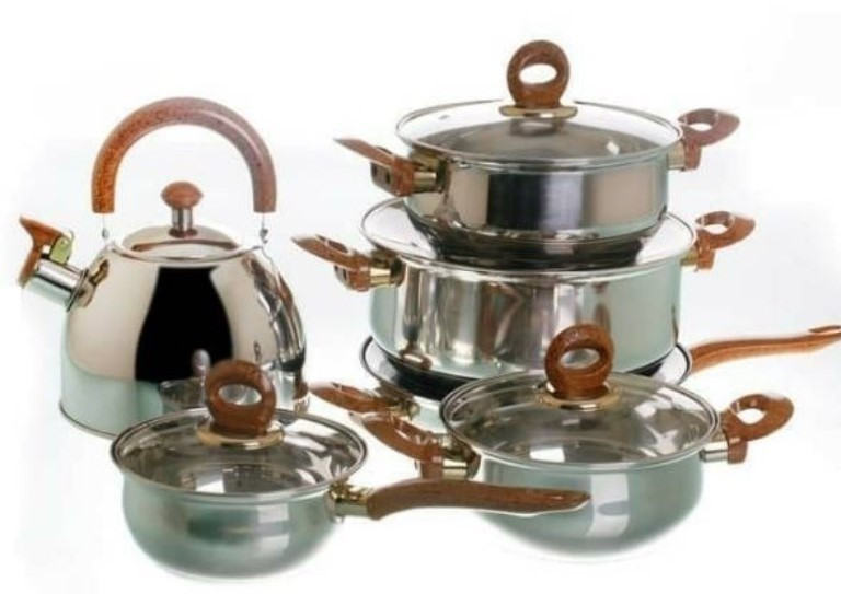 G012 Set de oale din inox 12 piese cu ceainic si manere bachelita cu capace de sticla